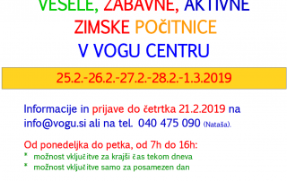 VESELE, ZABAVNE, AKTIVNE ZIMSKE POČITNICE V VOGU CENTRU 25.2.2019 - 26.2.2019 - 27.2.2019 - 28.2.2019 Informacije in prijave do četrtka 21.2.2019 na info@vogu.si ali na tel. 040 475 090 (Nataša). Od ponedeljka do petka, od 7h do 16h: * možnost vključitve za krajši č as tekom dneva * možnost vključitve samo za posamezen dan Namenjeno otrokom vseh starosti (od 5 . do [...]