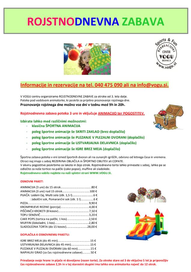 Rojstnodnevna zabava poteka 3 ure in vključuje animacijo ter pogostitev.