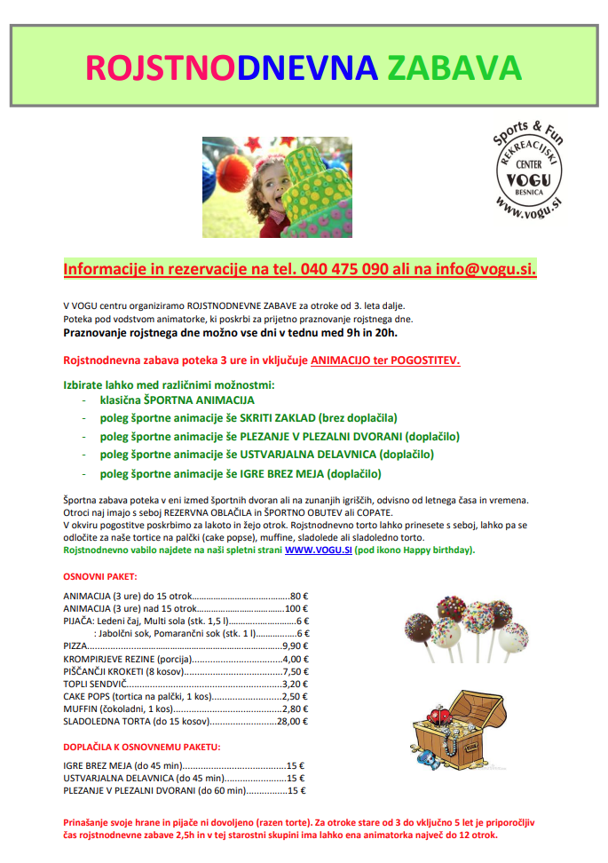 Rojstnodnevna zabava poteka 3 ure in vključuje animacijo ter pogostitev.